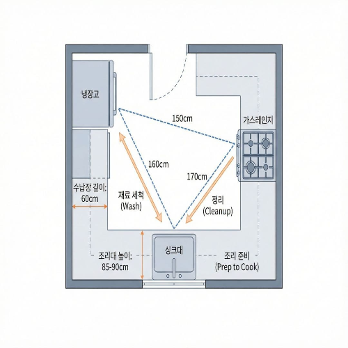 - 동선 우선: 냉장고-싱크대-가스레인지 삼각 동선 150~180cm 최적