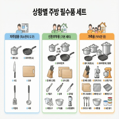 칼, 도마, 냄비, 프라이팬, 밥솥(또는 냄비), 접시, 그릇, 숟가락·젓가락, 컵, 수저통, 행주, 수세미, 주방 세제, 쓰레기통